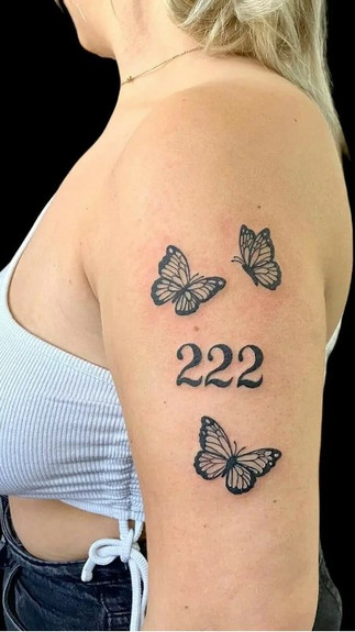 Butterfly: The butterfly and 222 tattoo is a famous and meaningful design that means a lot of different things. The number 222 is linked to balance, unity, spiritual awakening, and new beginnings. The butterfly is linked to change, new beginnings, hope, and creativity. They make a strong sign of personal growth, hope, and being in touch with your greater purpose when put together.